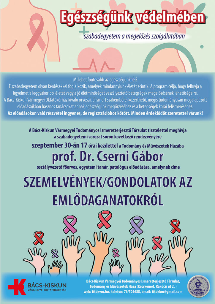 A Bács-Kiskun Vármegyei Oktatókórház kiváló főorvosai és elismert szakemberei közérthető, mégis tudományosan megalapozott előadásaikban hasznos tanácsokat adnak egészségünk megőrzéséhez és a betegségek korai felismeréséhez.