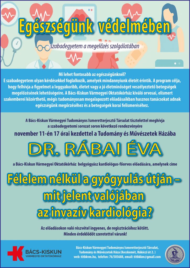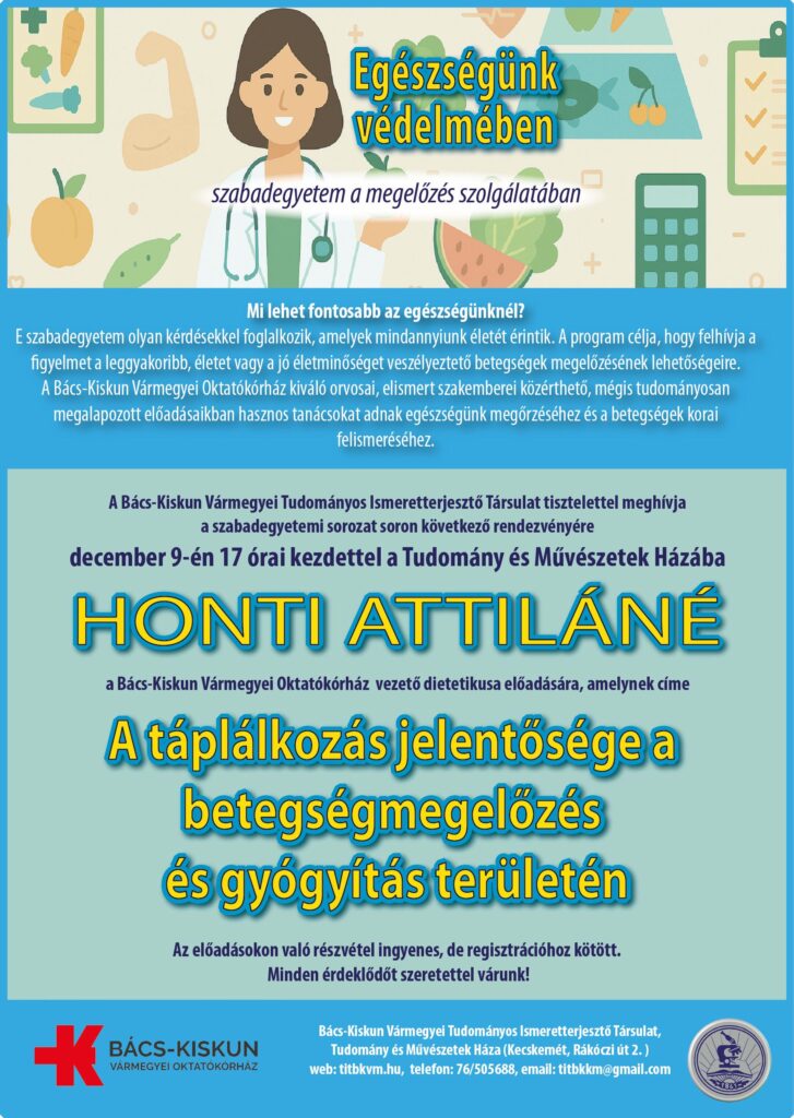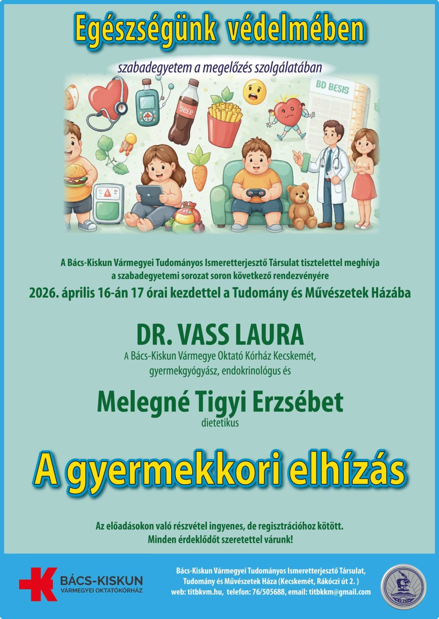 A Bács-Kiskun Vármegyei Tudományos Ismeretterjesztő Társulat tisztelettel meghívja Önt az „Egészségünk védelmében” című szabadegyetem következő előadására. Előadó: Dr. Endre Veronika, a Bács-Kiskun Vármegyei Oktatókórház belgyógyász adjunktusa. Előadás címe: „Túlsúlyunk kezelése a mindennapokban – avagy mit tehetünk az optimális súlyunkért”