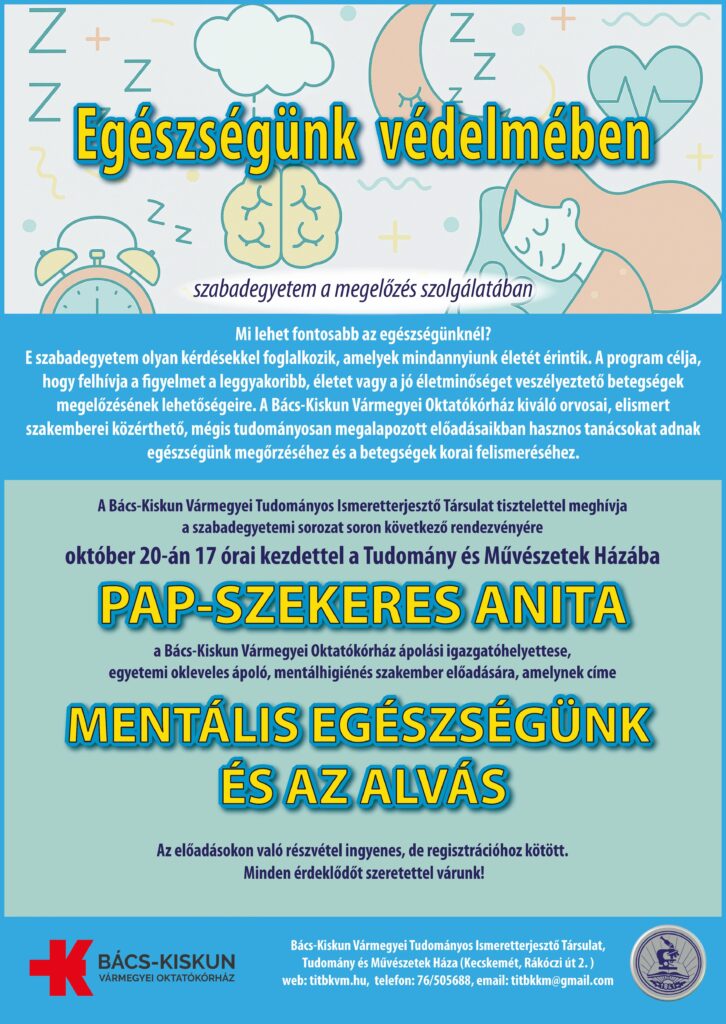 „Az alvás nem csupán pihenés, hanem létfontosságú tényező mentális egészségünk fenntartásában. A krónikus alvászavarok növelik a szorongás, depresszió és kognitív hanyatlás kockázatát, miközben gyengítik az érzelmi stabilitást és a stressztűrő képességet. Előadásunk tudományos alapokon mutatja be, hogyan hat az alvás minősége pszichés jólétünkre, és milyen lépésekkel előzhetjük meg a hosszú távú következményeket. Jöjjön el, és tudjon meg többet arról, hogyan őrizheti meg lelki egyensúlyát az alvás erejével!”