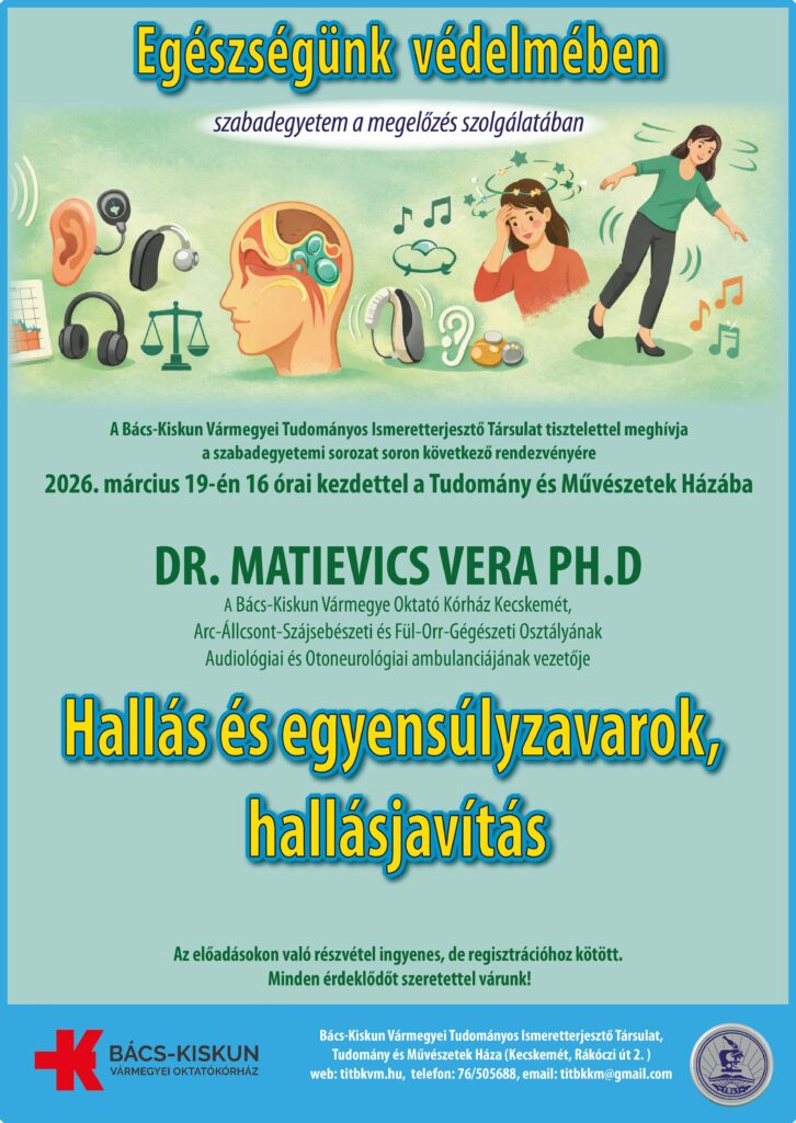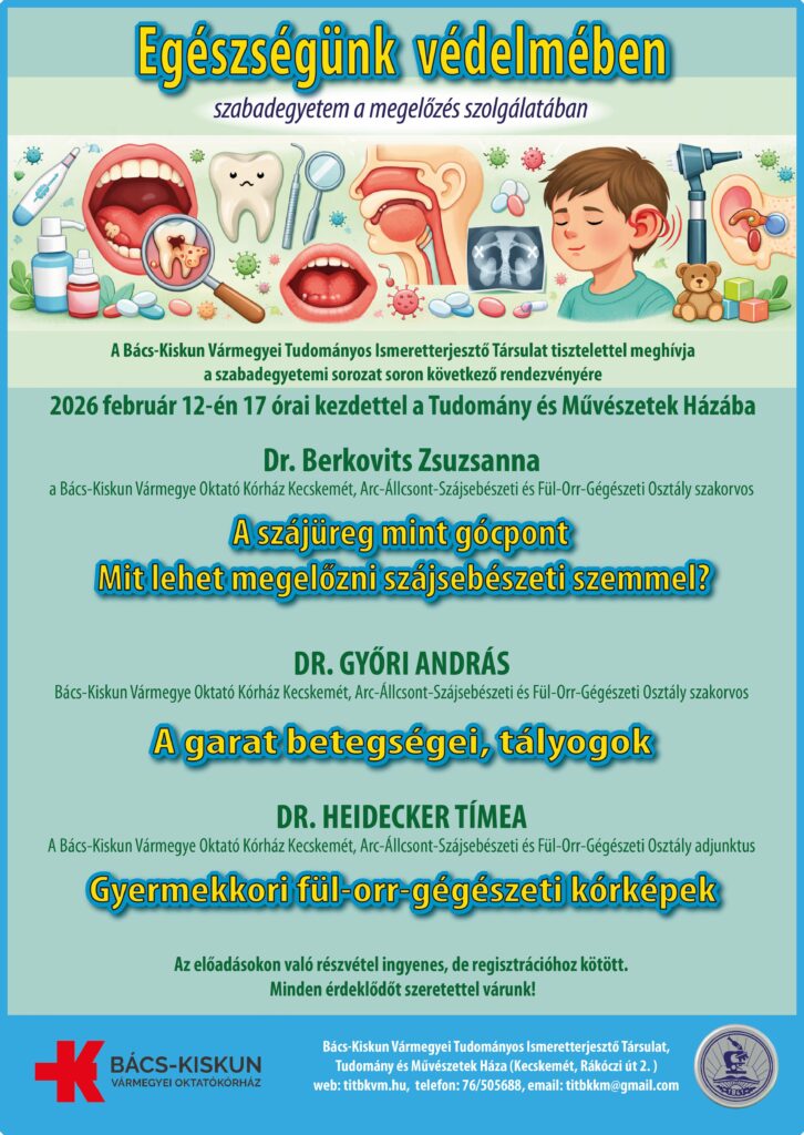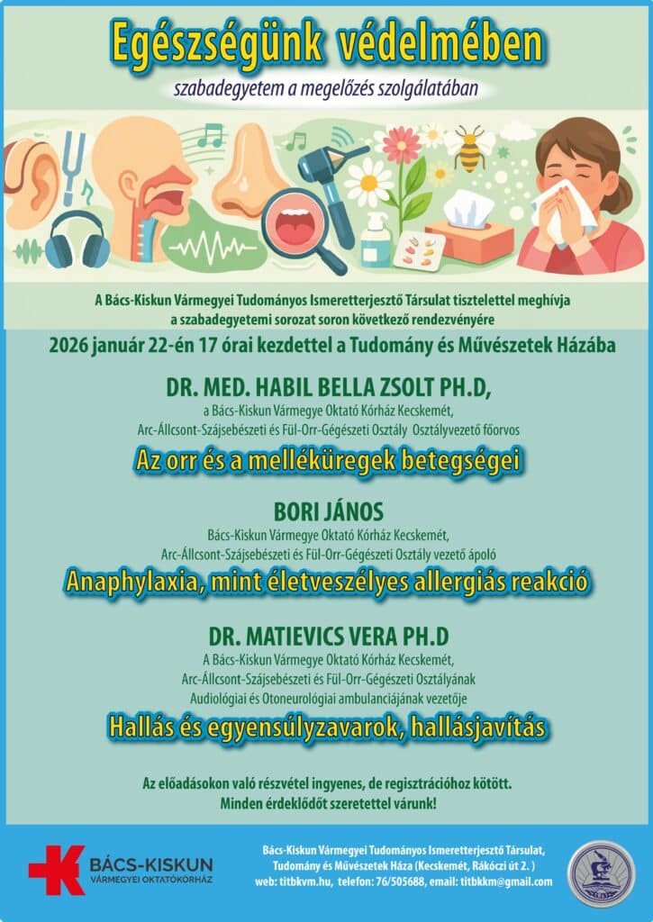 A Bács-Kiskun Vármegyei Oktatókórház elismert szakemberei, kiváló orvosai adnak hasznos tanácsokat egészségünk megőrzéséhez. A rendezvényt a Bács-Kiskun Vármegyei Tudományos Ismeretterjesztő Társulat és a Bács-Kiskun Vármegyei Oktatókórház közösen szervezi.